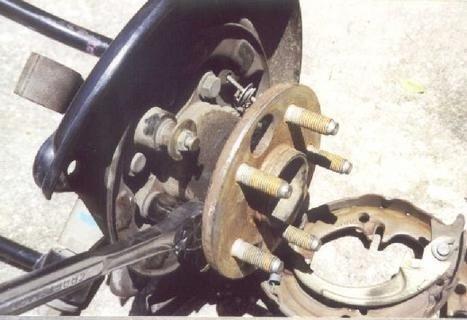 Now remove the spindle and drum brake backplate assembly. Save the small rubber seal or purchase a new one from the dealer - they're inexpensive but critical for proper sealing.